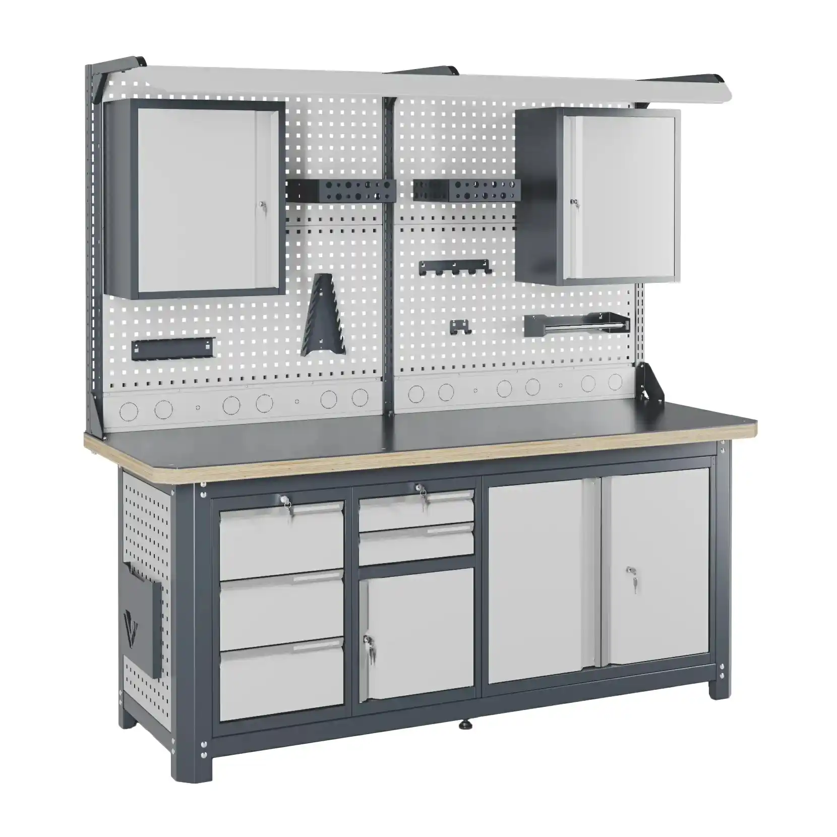 - Экран (перфорированная панель) верстака выполнен с квадратной перфорацией 12х12 мм с шагом 38 мм для установки крючков, держателей и других аксессуаров. Экран крепятся к столешнице с помощью специальных кронштейнов. Максимальная масса груза, равномерно распределенного по поверхности экрана, составляет 71 кг.