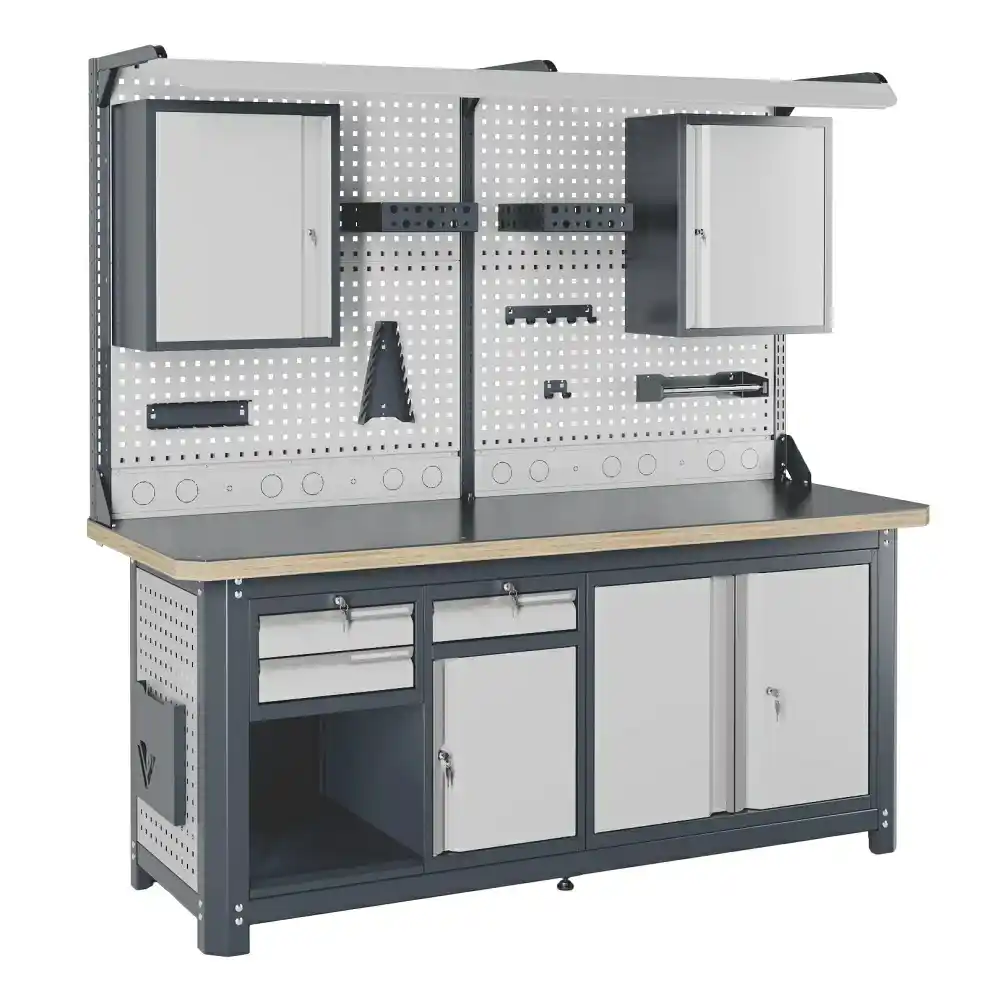 - Экран (перфорированная панель) верстака выполнен с квадратной перфорацией 12х12 мм с шагом 38 мм для установки крючков, держателей и других аксессуаров. Экран крепятся к столешнице с помощью специальных кронштейнов. Максимальная масса груза, равномерно распределенного по поверхности экрана, составляет 71 кг.