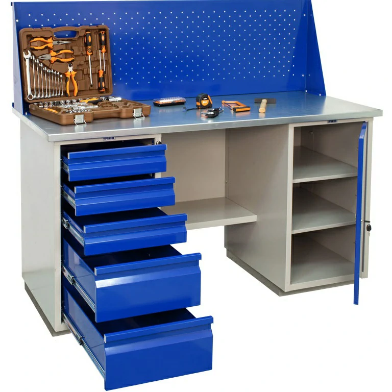 Столешница из МДФ или фанеры (зависит от типа верстака). Покрыта оцинкованным листом. Нагрузка на столешницу до 3000 кг (зависит от типа верстака).
