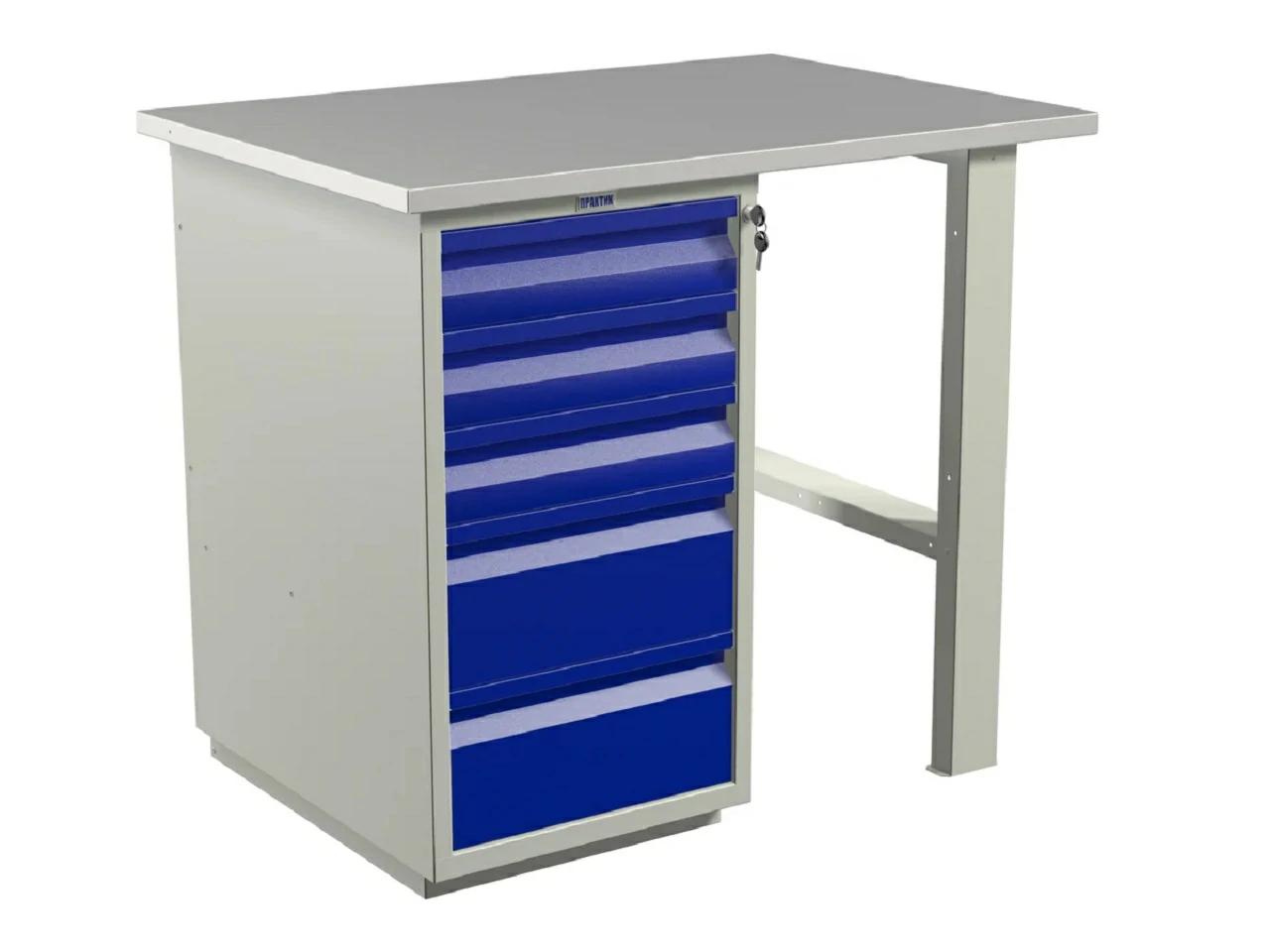- Верстак окрашен порошковой краской, цвет покрытия корпуса серый шагрень (RAL 7038), лицевая панель дверцы тумбы синий шагрень (RAL 5002)