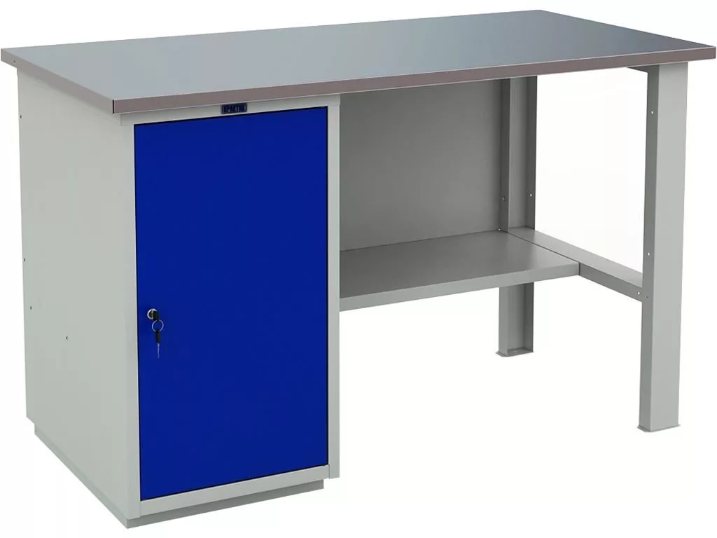 - Верстак окрашен порошковой краской, цвет покрытия корпуса серый шагрень (RAL 7038), лицевая панель дверцы тумбы синий шагрень (RAL 5002)