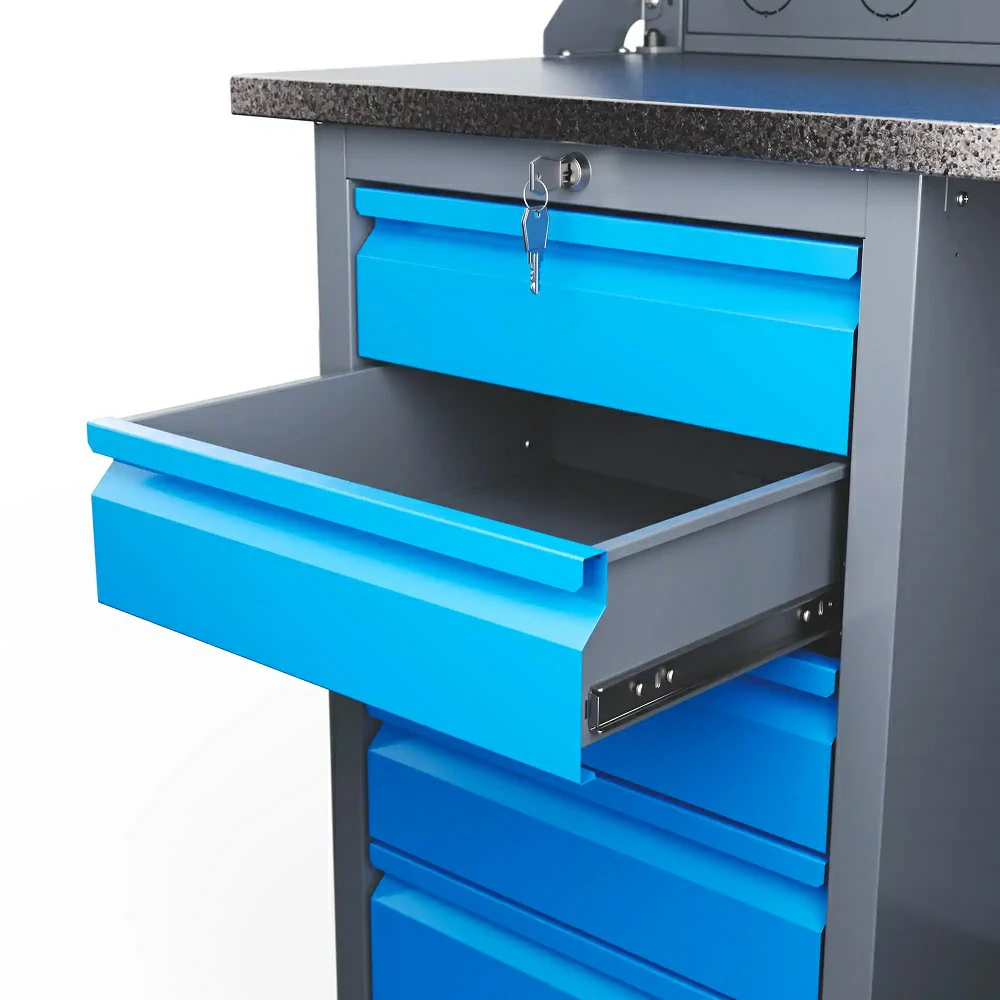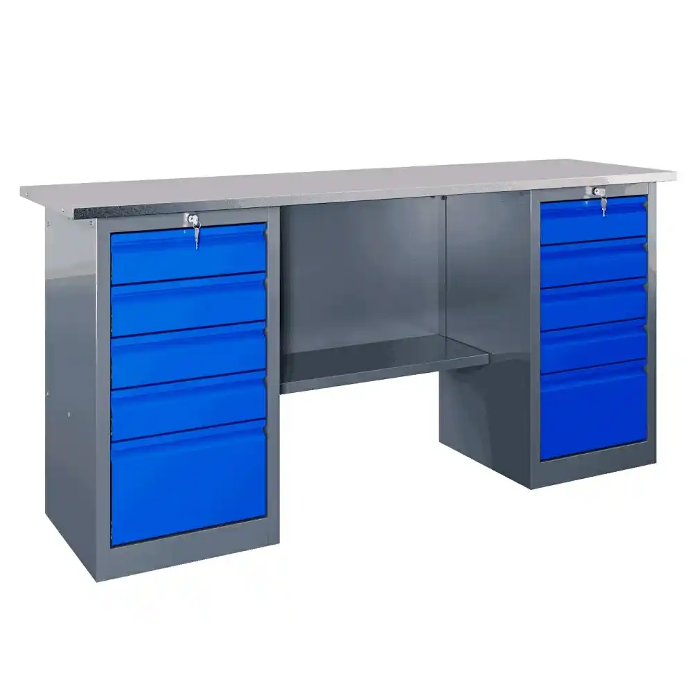 Особенность данной модели – наличие двух объемных тумб, которые и служат опорой всей конструкции. Каждая тумба оснащена пятью ящиками, центральным замком – любой инструмент будет всегда у вас под рукой. В комплектации предусмотрена нижняя полка.
