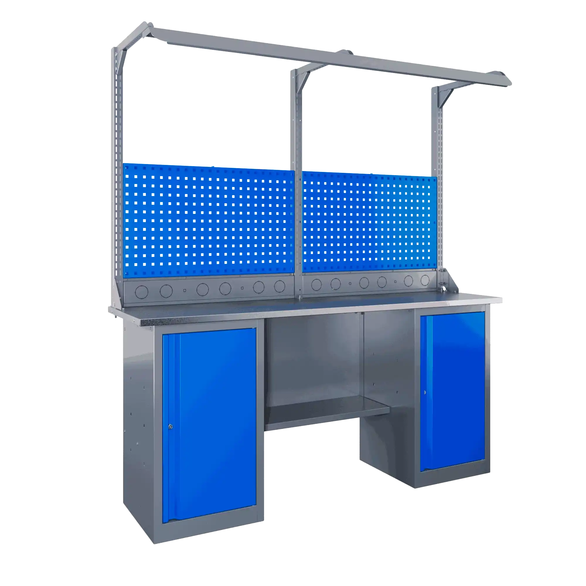 Верстак оснащен двумя объемными тумбами, которые разделены на две полки внутри. Каждая тумба имеет замок для надежного хранения инструментов. Между тумбами внизу располагается полка для складирования больших по размерам предметов.