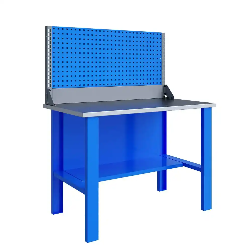 - Экран (перфорированная панель) верстака выполнен с квадратной перфорацией 12х12 мм с шагом 38 мм для установки крючков, держателей и других аксессуаров. Экран крепится к столешнице с помощью специальных кронштейнов. Максимальная масса груза, равномерно распределенного по поверхности экрана, составляет 50 кг.
