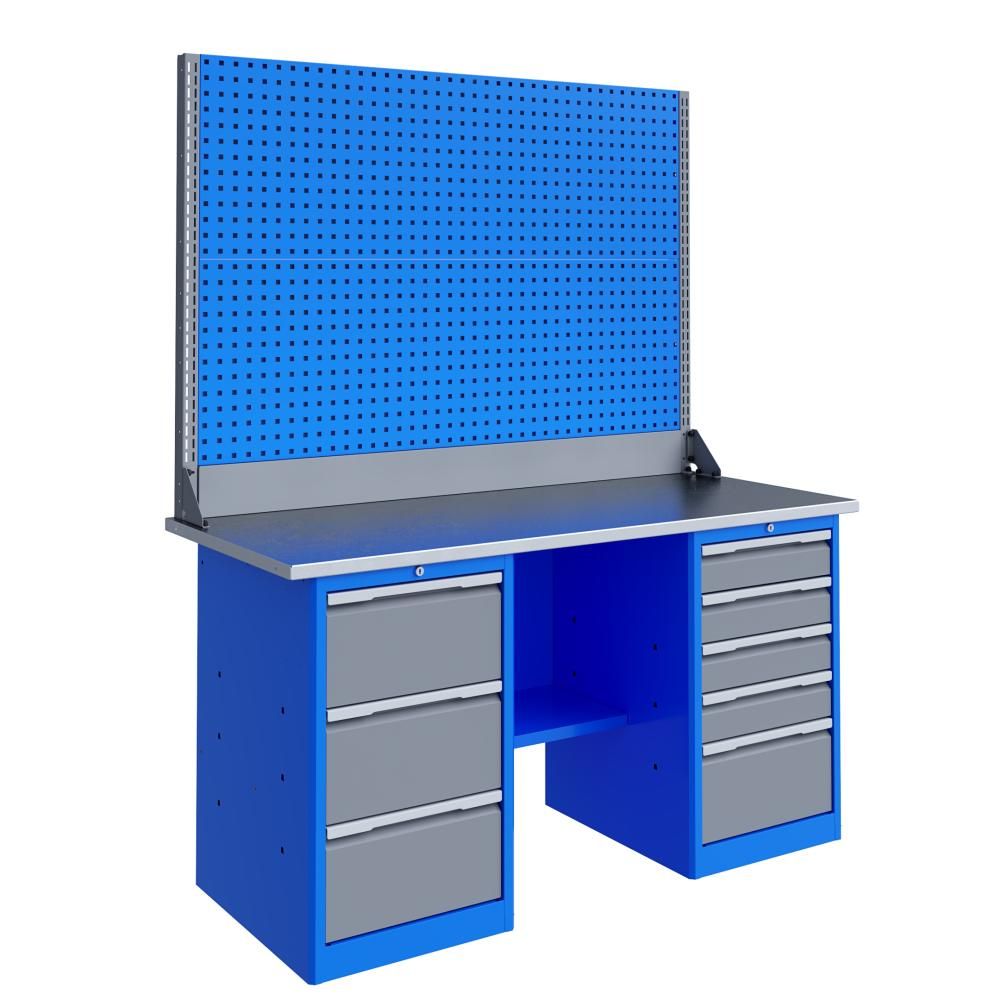 - Двойной экран (перфорированные панели) верстака выполнен с квадратной перфорацией 12х12 мм с шагом 38 мм для установки крючков, держателей и других аксессуаров. Экран крепится к столешнице с помощью специальных кронштейнов. Максимальная масса груза, равномерно распределенного по поверхности экрана - 21 кг.