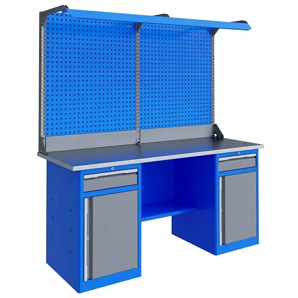 - Организация хранения: Полка-стенка: Под столешницей для габаритного инструмента.Сварные тумбы: Оснащены шариковыми направляющими полного выдвижения.Тумба P6: 6 малых ящиков (103x397x520 мм), общий центральный замок.Тумба P8: 1 малый ящик (с замком) и отделение с регулируемой полкой и реверсивной дверцей (с замком). В комплекте 2 ключа на замок.