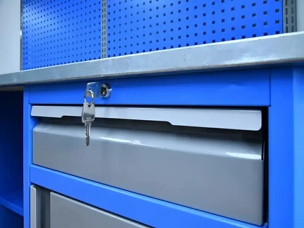 - Организация хранения: Полка-стенка: Под столешницей для габаритного инструмента.Сварные тумбы: Оснащены шариковыми направляющими полного выдвижения.Тумба P6: 6 малых ящиков (103x397x520 мм), общий центральный замок.Тумба P8: 1 малый ящик (с замком) и отделение с регулируемой полкой и реверсивной дверцей (с замком). В комплекте 2 ключа на замок.