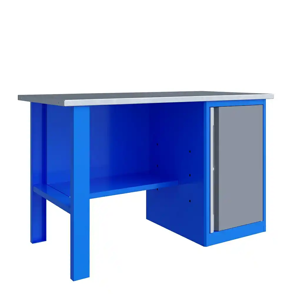 - Тумба верстака - сварная.В тумбе P7 установлено две полки. Полки устанавливаются на парах специальных формованных зацепов, выполненных в боковых стенках тумбы. Имеется возможность смены стороны открывания двери. Дверь тумбы снабжена центральным замком с поворотом ригеля 180 градусов. В комплекте имеется два ключа.