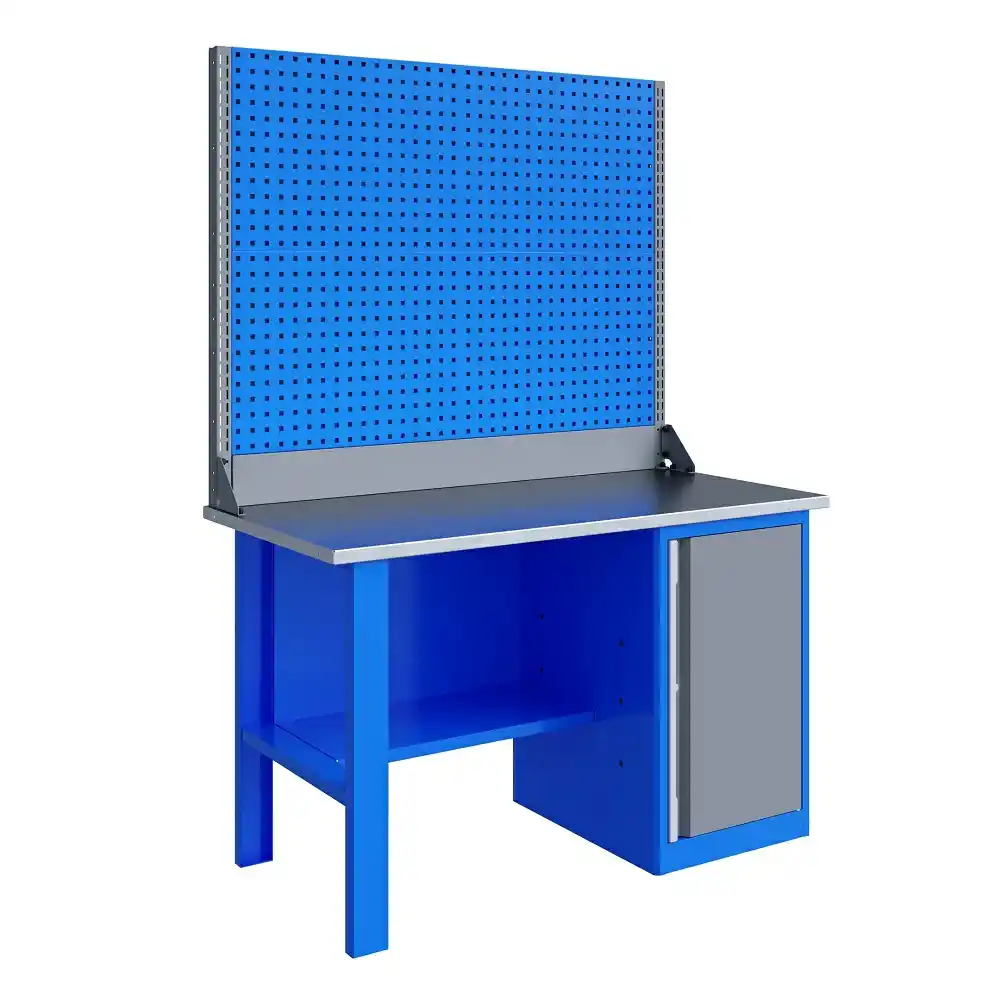 - Верстак комплектуется полкой-стенкой, расположенной под столешницей для удобного размещения габаритного инструмента и оснастки.