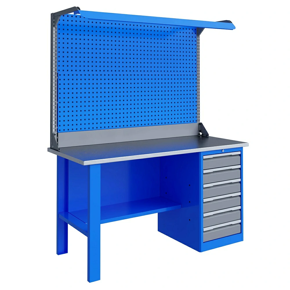 - Верстак комплектуется полкой-стенкой, расположенной под столешницей для удобного размещения габаритного инструмента и оснастки.