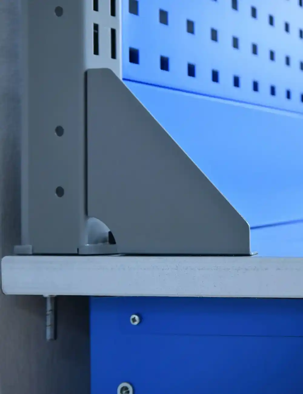- Двойной экран (перфорированные панели) верстака выполнен с квадратной перфорацией 12х12 мм с шагом 38 мм для установки крючков, держателей и других аксессуаров. Экран крепится к столешнице с помощью специальных кронштейнов.