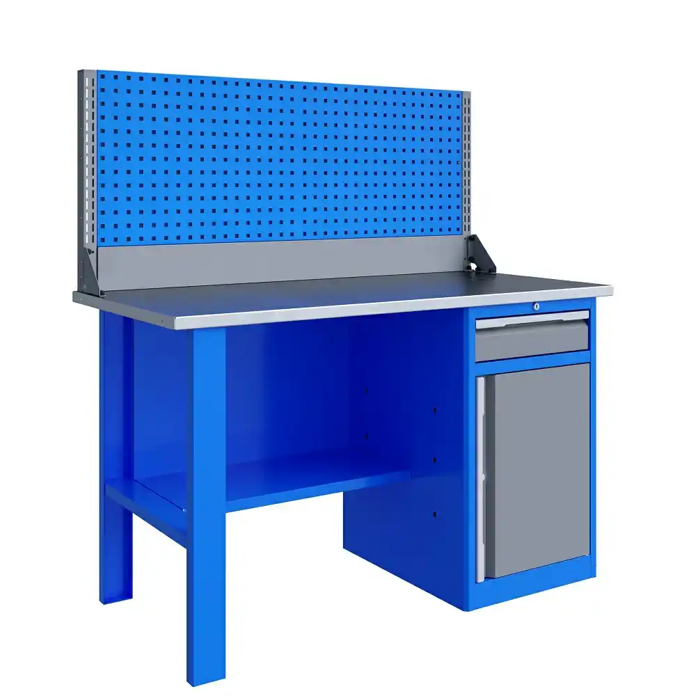 - Верстак комплектуется полкой-стенкой, расположенной под столешницей для удобного размещения габаритного инструмента и оснастки.