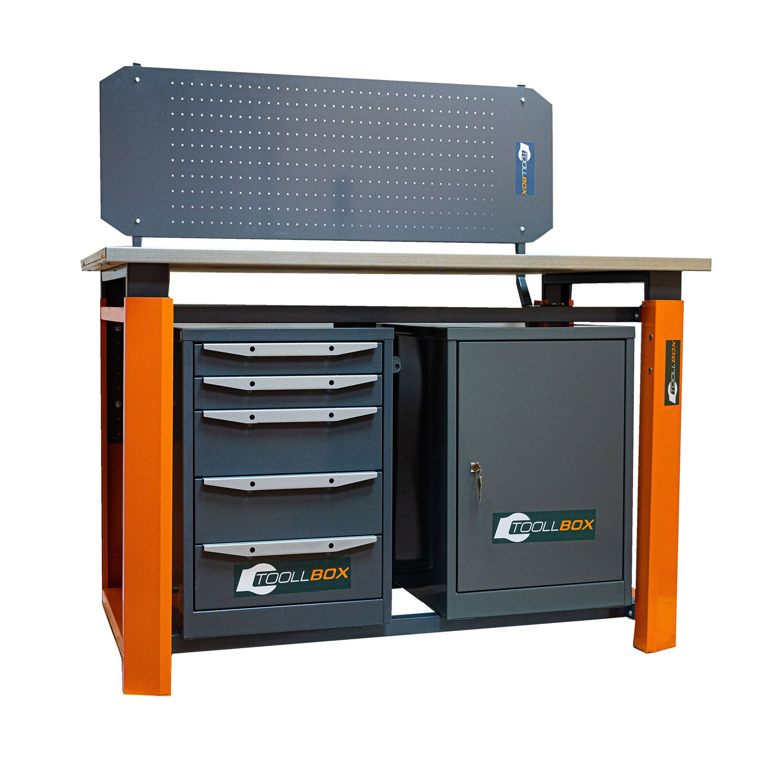 - Тумбы верстака комплектуются дверцей (запирается на почтовый замок) со съемной внутренней полкой, или различным количеством выдвижных ящиков трех типоразмеров по высоте