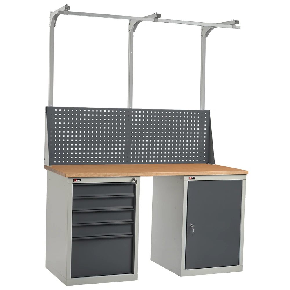 Верстак ВЛ-150-Ф-07+Э2 предназначен для слесарных работ на производстве, в гаражах и автомастерских, а также для промышленных предприятий среднего и тяжелого машиностроения. Все элементы сварные.