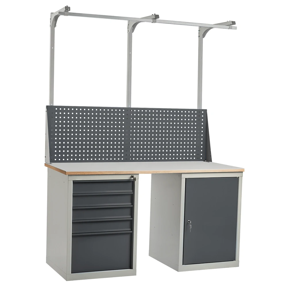 Верстак ВЛ-150-МФ-07+Э2 предназначен для слесарных работ на производстве, в гаражах и автомастерских, а также для промышленных предприятий среднего и тяжелого машиностроения. Все элементы сварные.