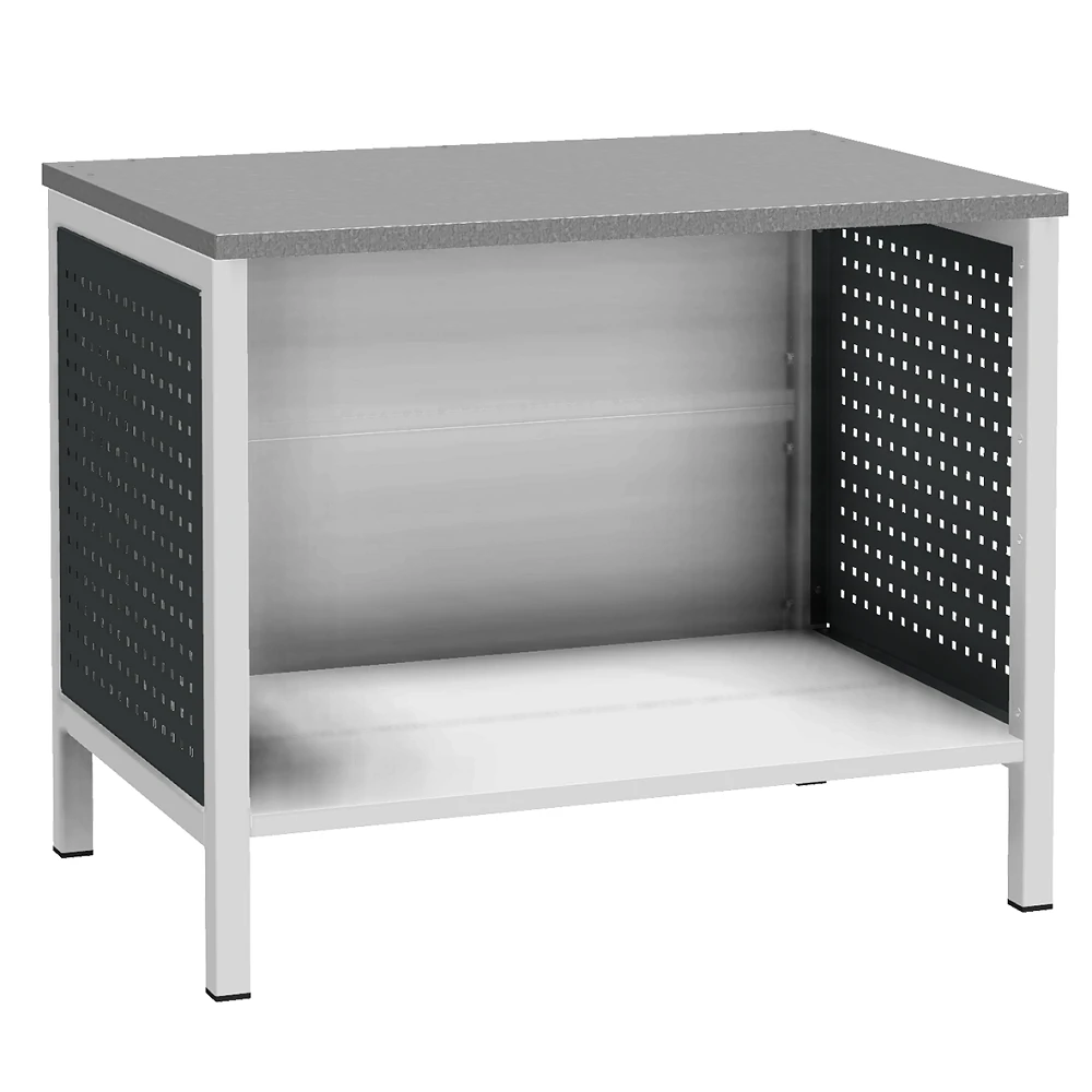 Функциональный верстак ВЛ-К-100-03 для гаражей и мастерских. Используются для хранения оснастки, инструмента и материалов. При необходимости столы инструментальные могут укомплектовываться съёмными перфорированными экранами с полками, лотками, держателями инструмента, крючками, пластиковыми ящиками, освещением и дополнительным экраном.