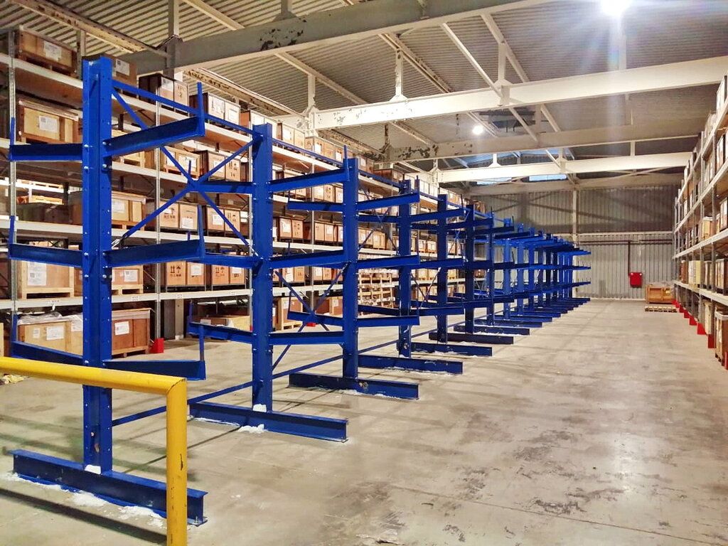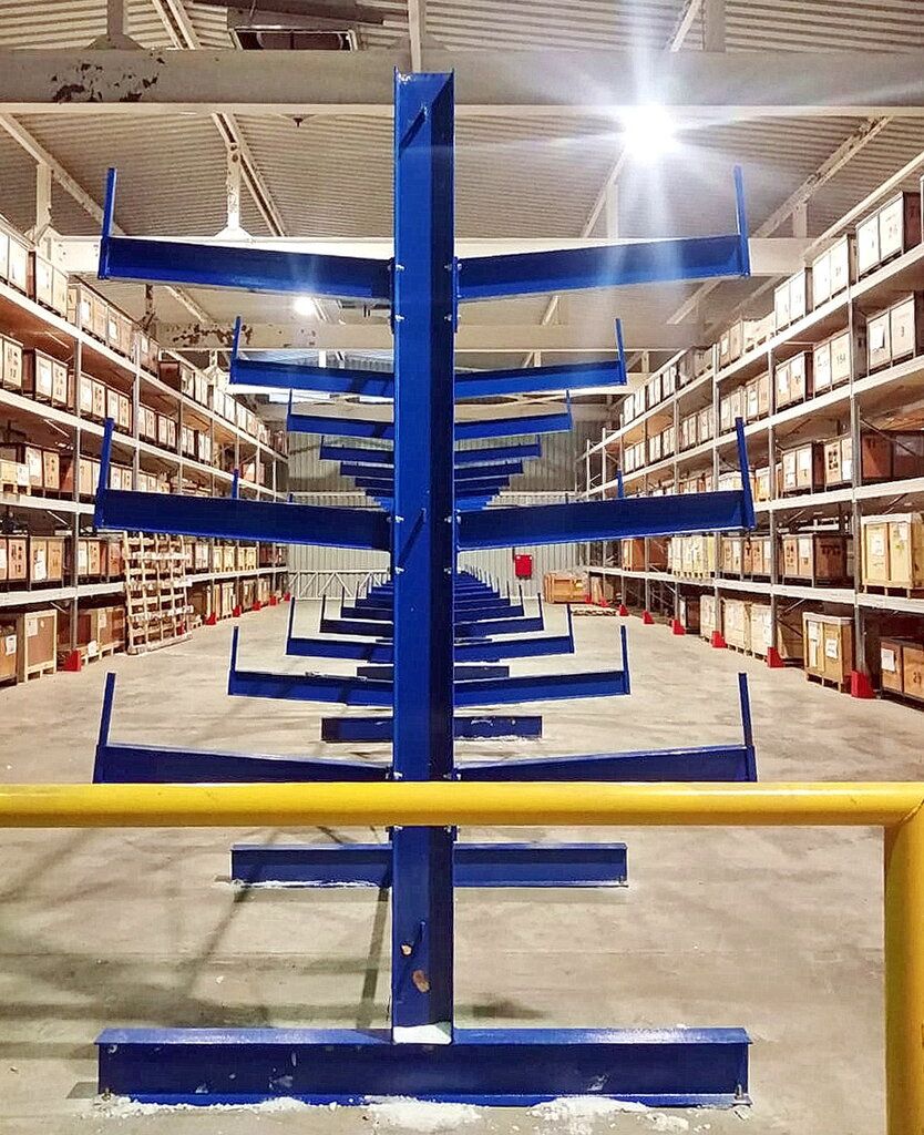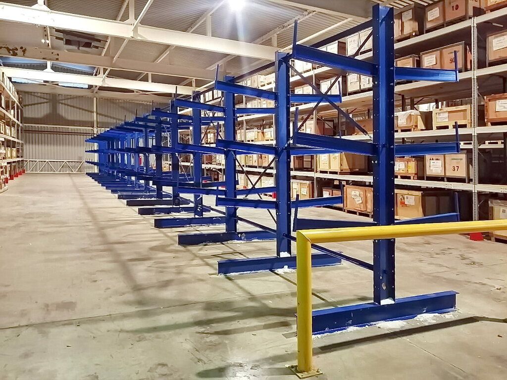 На складе нашего давнего Заказчика смонтированы консольные стеллажи для хранения погонажной продукции (металлических труб). Уровней хранения : 3 + основание. Высота стеллажей 3 метра, длина каждой консоли 0,85 м. Конструкция металлическая, сборно-разборная. Нагрузка на 1 консоль (легкий тип консоли) = 400 кг, нагрузка на весь стеллаж = 51 000 кг. Крепление к полу анкерное.