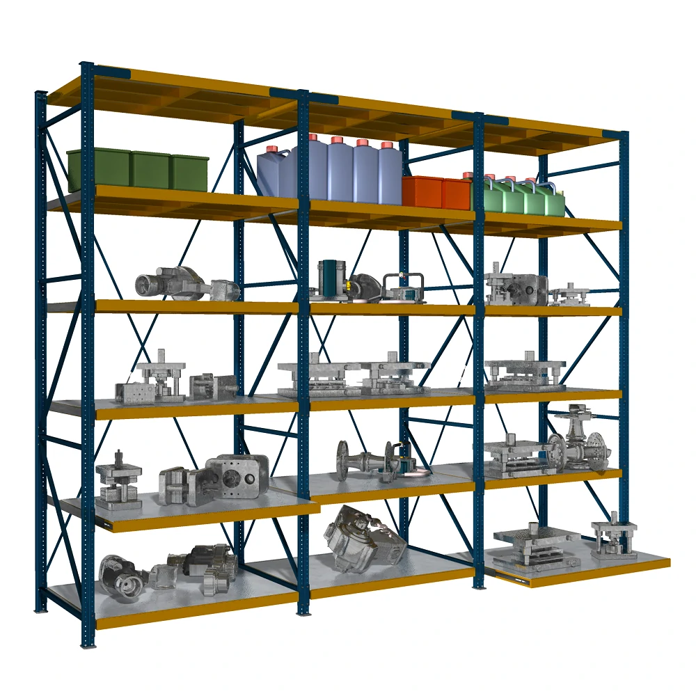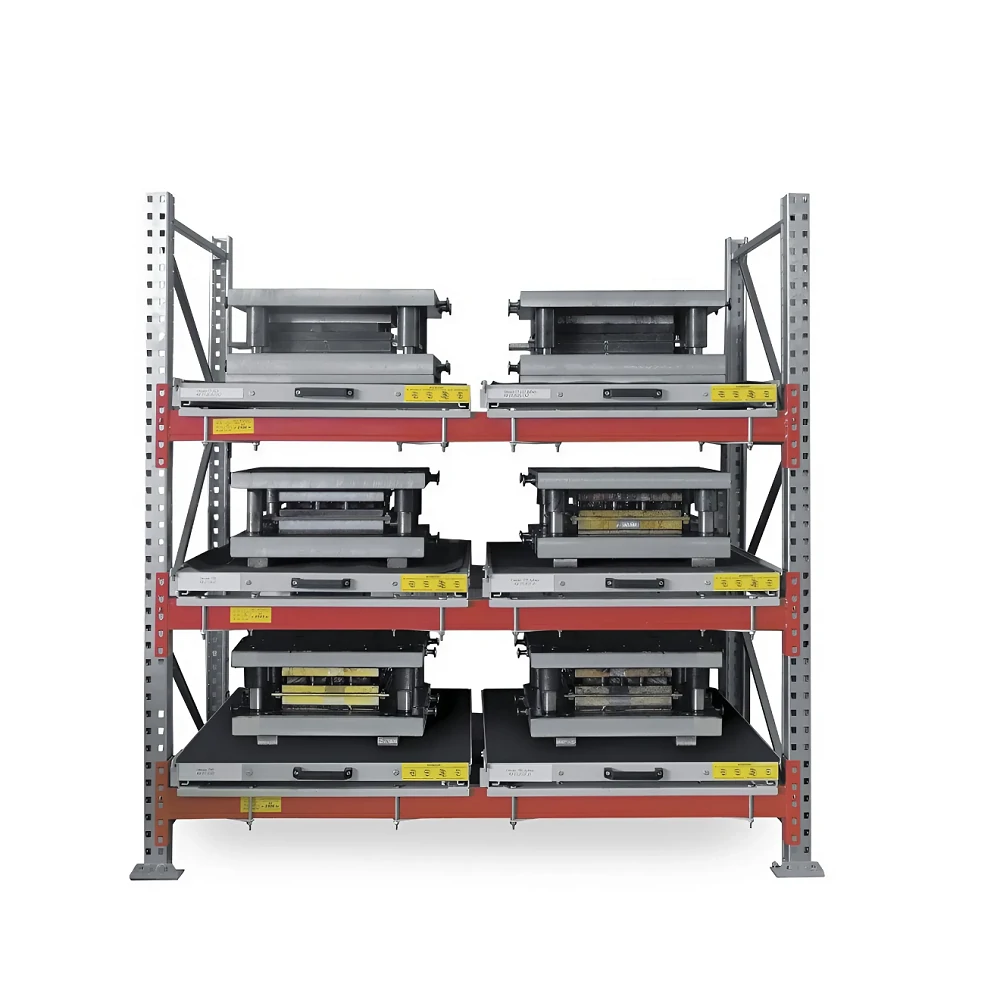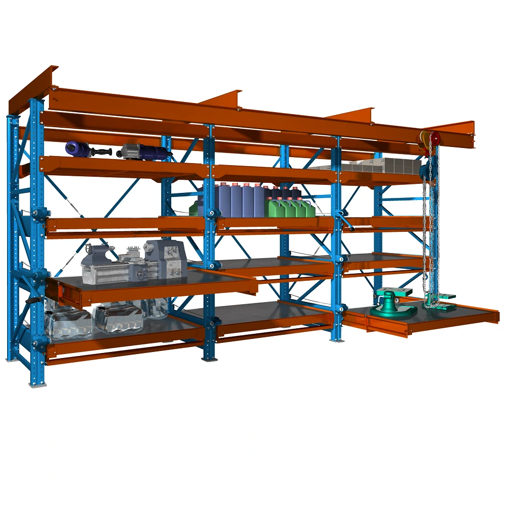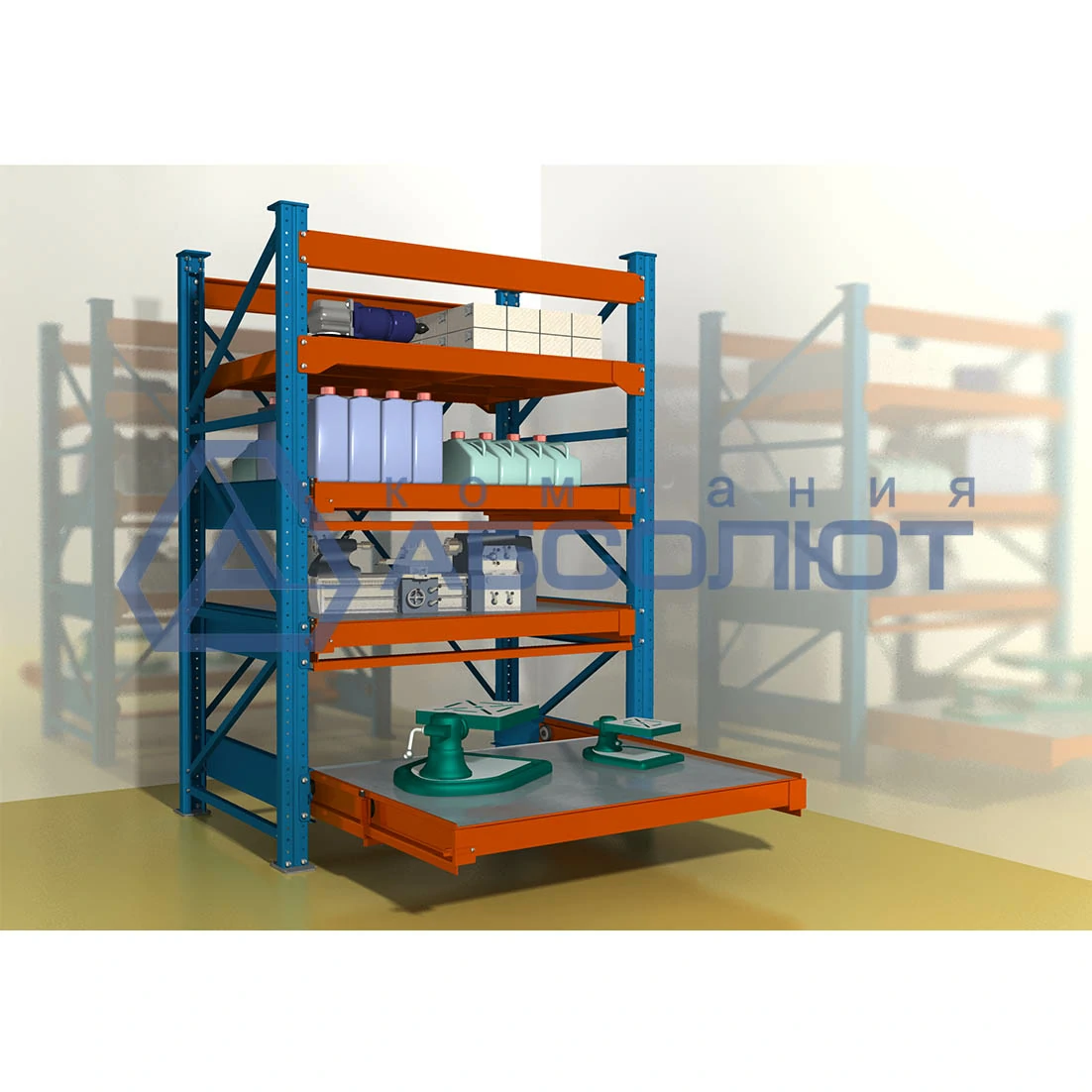 Стеллажи с выкатными платформами (полками) предназначены для хранения пресс-форм, оснастки, инструмента, грузов в цехах и производственных помещениях.