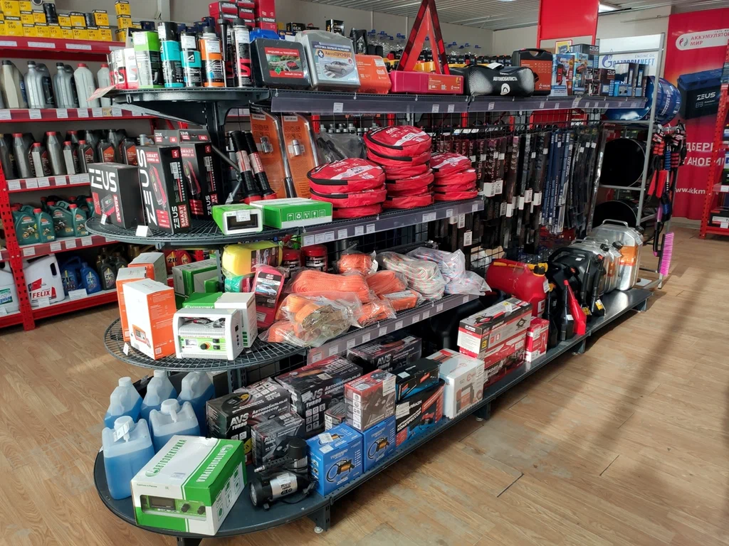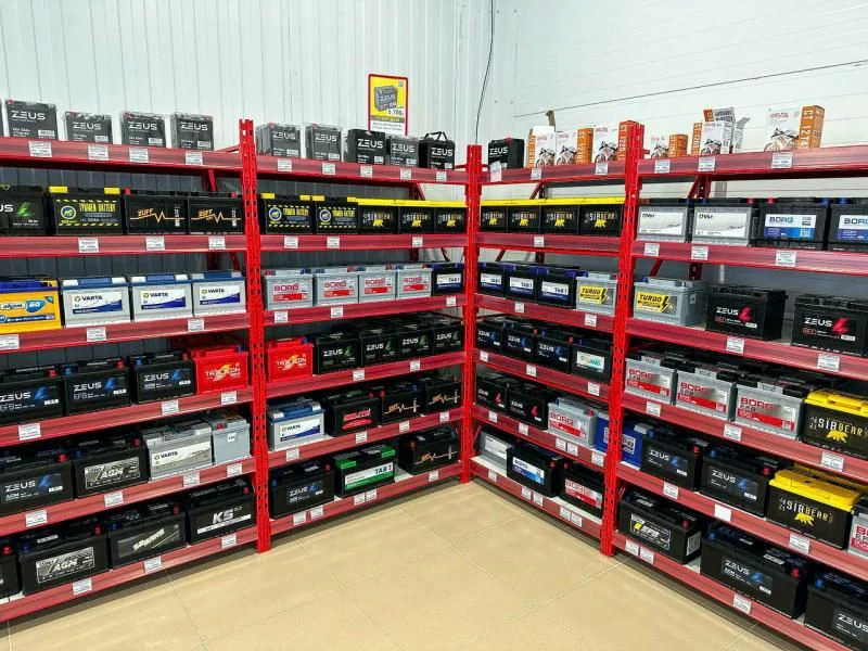 - Среднегрузовые полочные стеллажи, высотой 2000 мм и глубиной 600 мм., которые идеально подходят для выкладки аккумуляторов, нагрузка на ярус до 500 кг, нагрузка на секцию такого стеллажа до 3500 кг. Конструкция полностью металлическая, сборно-разборная. Количество ярусов и расстояние между ними у этого типа стеллажей может меняться за счет перфорации на рамах с шагом 50 мм. Соединение рама/балка безболтовое – на зацепах. Настил (полки стеллажа) секционный, металлический. Красный цвет стеллажей удачно вписался в стилистику магазина.