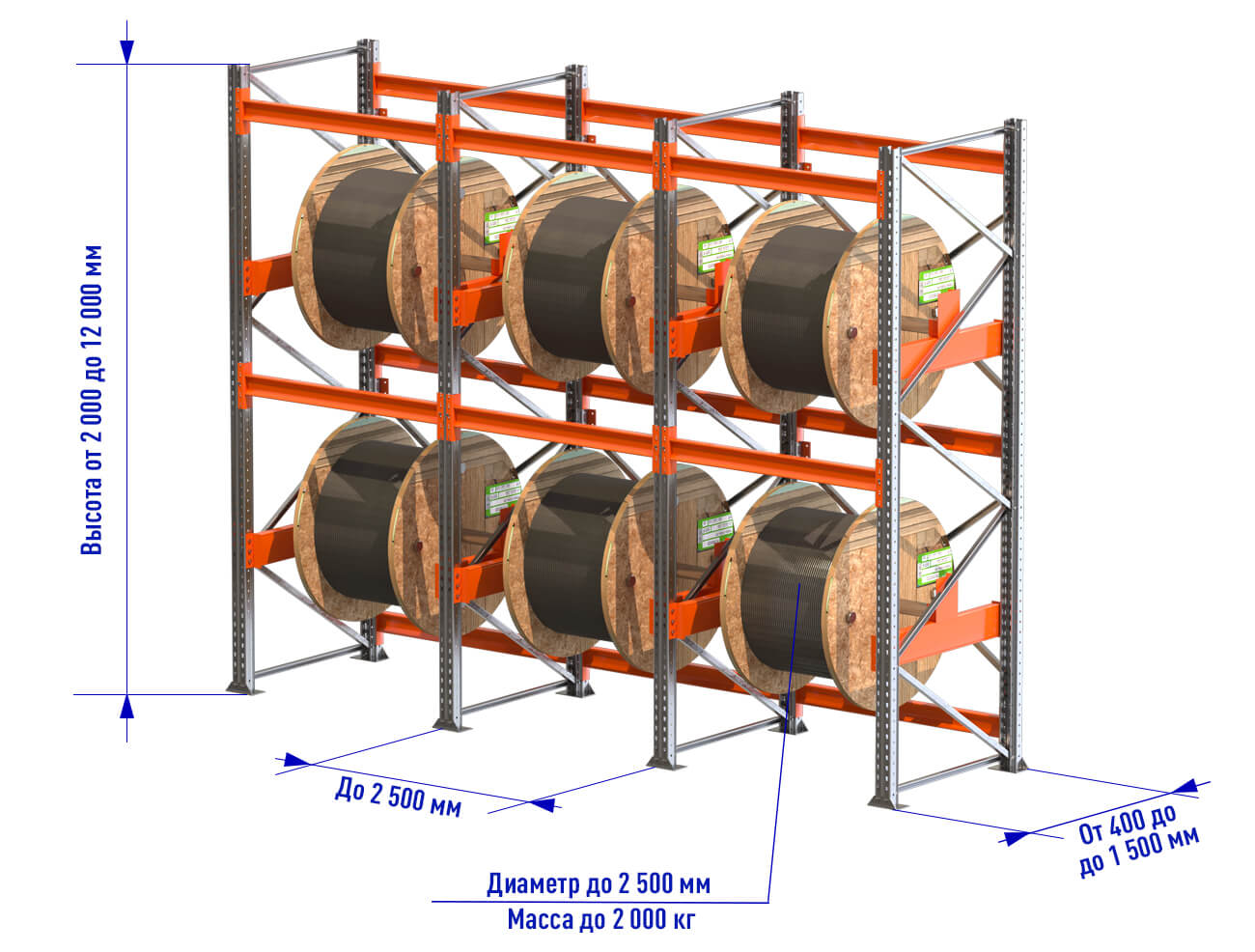 При выборе необходимо учитывать следующие параметры:- Размеры и вес барабанов — диаметр, ширина и вес бухт с кабелем. От корректности этой информации зависит конструкция стеллажа и ее грузоподъемность, количество ярусов и расстояние между ними.