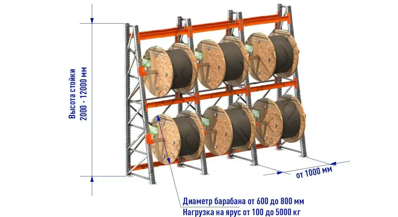Стеллажи для кабеля – это специализированное стеллажное оборудование, предназначенное для хранения кабельной продукции в бухтах (барабанах), разработанные с учетом количества бухт с кабелем, их размеров и веса.